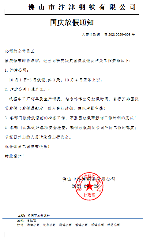 您當前的位置:日本在线观看(bó)鋼管廠家 - 鋼(gāng)材世界 - 公司新聞 - 汴津鋼鐵2021年國慶節放假安排